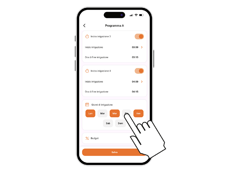 Elettra BT ofrece 2 programas de riego A y B, cada uno con hasta 4 horarios de inicio. Seleccione el programa deseado.