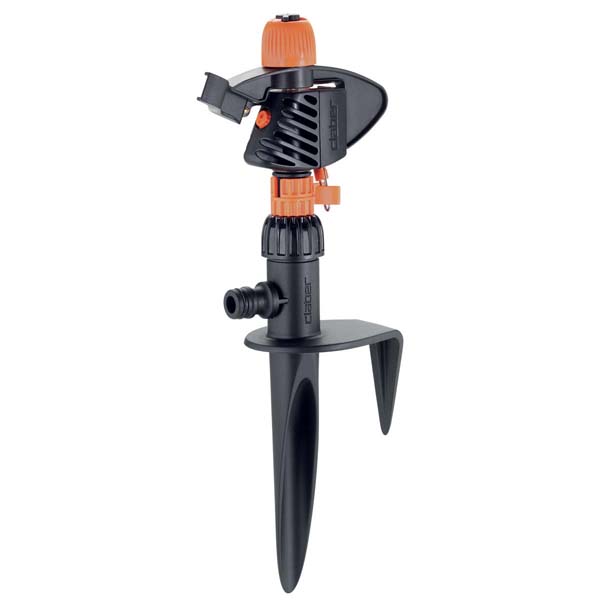 Cabezal intermitente para regar sectores de 0° a 360° o rotación continua, montado en piquete de plástico de doble punta. Tornillo para romper el chorro y regar de forma uniforme. Regulación automática hasta 4 bar y dispositivo para presiones más altas. Área regada max. 397 m².