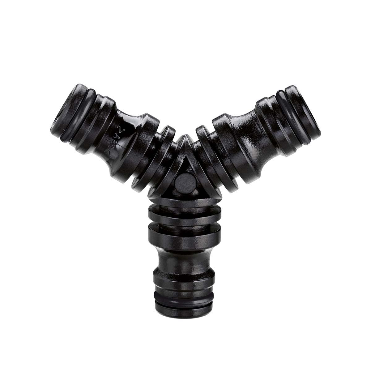 Une con un ”clic” tres mangueras y transforma una línea única de riego en una línea doble.