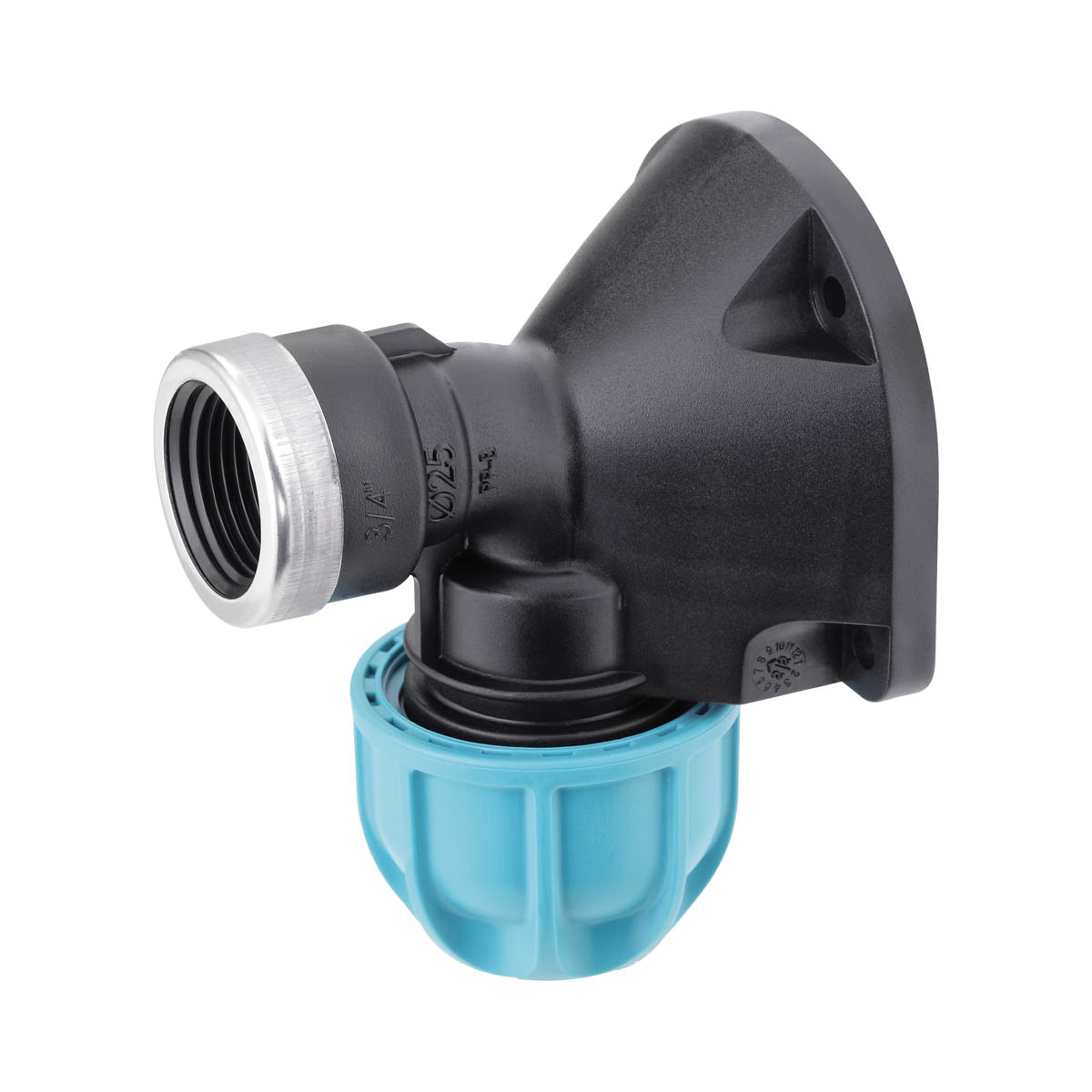 Placa de pared en ángulo para empalmar un tubo de polietileno de 25 mm y un grifo con acoplamiento 3/4" M, creando una nueva toma de agua conectada al sistema. Fijación a la pared con tornillos y tacos (no incluidos).