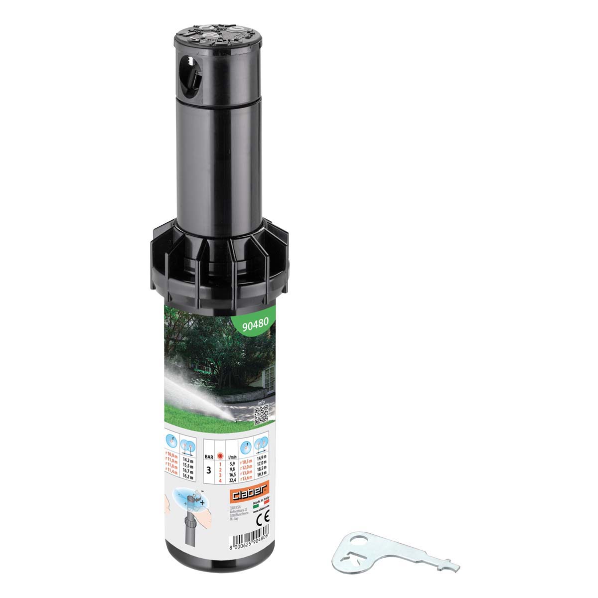 Aspersores de turbina con 4 boquillas incorporadas para garantizar un riego siempre balanceado con cualquier ángulo de trabajo seleccionado (regulable de 40° a 360°). Con un destornillador común se puede seleccionar la boquilla a utilizar, configurar el arco del chorro deseado y regular el flujo. Boquillas diseñadas específicamente para garantizar máxima eficiencia y ahorro de energía. Excelentes prestaciones incluso con baja presión. Filtro interno. Presión de trabajo recomendada entre 2 y 5 bar. Radio de 9,8 a 11 m. Base roscada de 3/4” (20-27 mm) hembra, alza 5” (12,5 cm). Área regada max. 580 m².