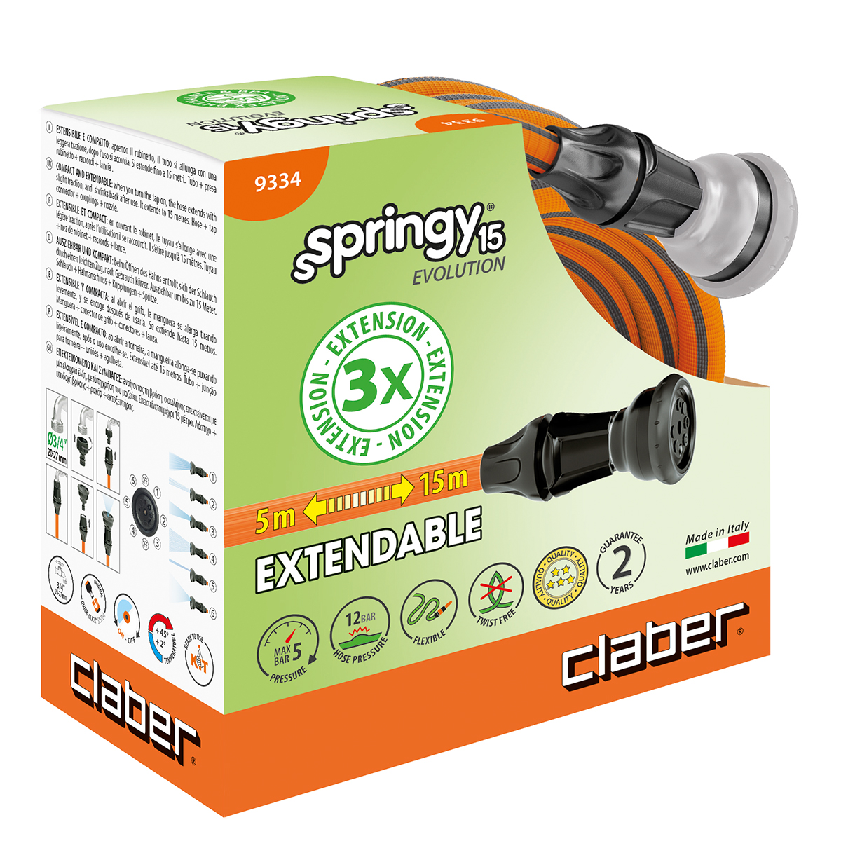 Suave, manejable y resistente al desgaste, la mangiera extensible Springy es una solución “salvaespacio” ideal para las más variadas necesidades de riego e incluso para la limpieza de exteriores.