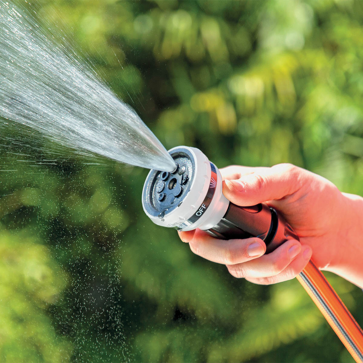 Manguera extensible, compacta y en un kit listo para usar. Al pasar el agua, la manguera se extiende hasta triplicar su longitud (longitud máx. 25 m); después del uso, la manguera se recoge sola, para guardarla ocupando un espacio mínimo. Materiales atóxicos y de primera calidad. Kit compuesto por conexión de grifo 3/4”, conectores automáticos y lanza multifunción, para escoger entre 6 chorros distintos (+ 2 posiciones OFF). Presión máx. de uso: 5 bar.