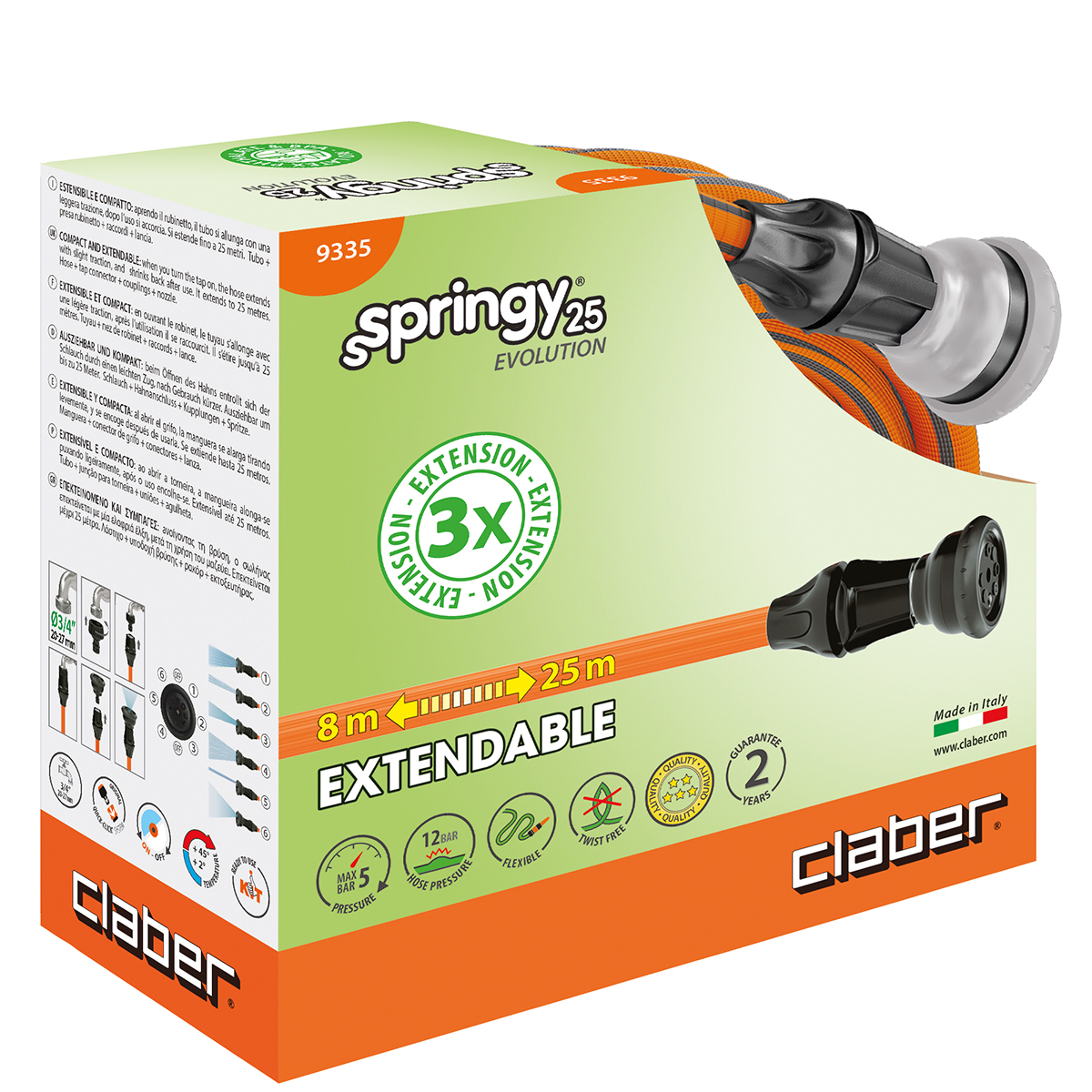 Suave, manejable y resistente al desgaste, la mangiera extensible Springy es una solución “salvaespacio” ideal para las más variadas necesidades de riego e incluso para la limpieza de exteriores.