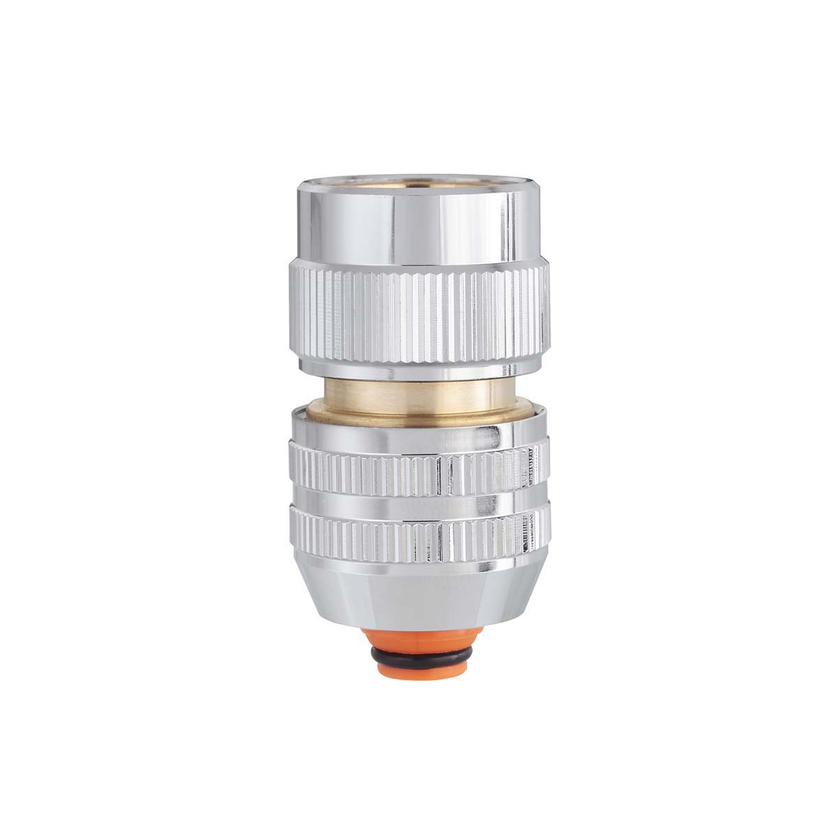 Conector automático para mangueras de 1/2” (12,5 mm) - 5/8” (15 mm) de diámetro, de latón cromado. Incorpora una válvula para el corte automático del agua, y se monta en el extremo de la manguera; al quitar el conector, el flujo de agua se bloquea. Provisto de 6 esferas internas para garantizar un acoplamiento automático con una estanqueidad perfecta. El anillo de cierre, cuyo perfil es un diseño exclusivo de Claber, identifica el producto y mejora el agarre.