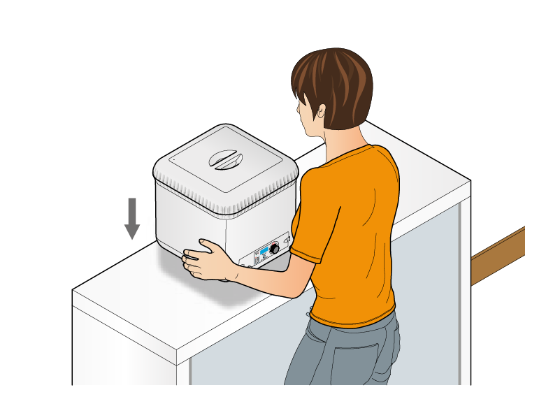 Après avoir choisi l'emplacement, soulevez Oasis Evolution par le fond à l'aide des deux mains et placez-le sur un meuble ou une étagère, à une hauteur du sol d'au moins 100-110 cm : le meuble ou l'étagère d'appui doivent être stables, avoir un plan horizontal et doivent pouvoir soutenir le poids d’Oasis Evolution lorsqu 'il est rempli d'eau (environ 27 kg). Assurez-vous aussi qu’Oasis Evolution se trouve à au moins 70-80 cm du bord du pot le plus haut.