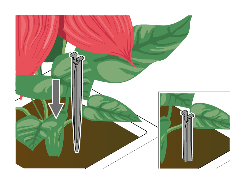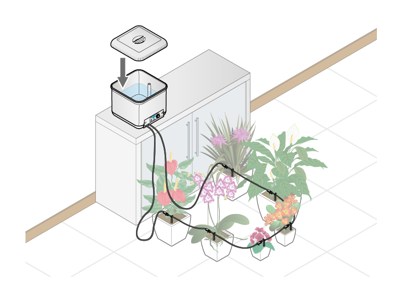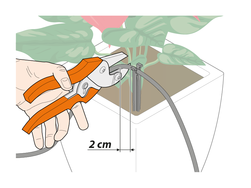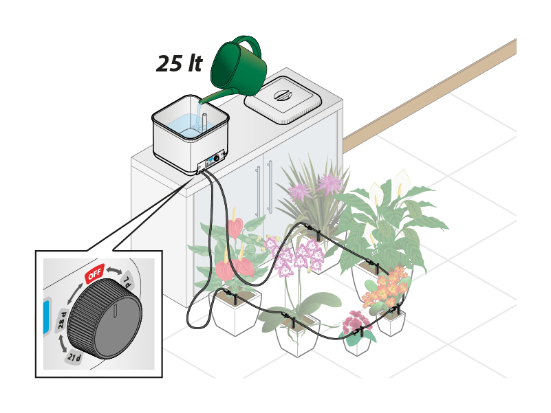 Planter les pics en plastique fournis dans la terre des pots : un goutteur sera ensuite attribué à chaque pic (le nombre maximum de goutteurs utilisables avec Oasis Evolution est 20, le minimum 1. Le tuyau peut être étendu jusqu'à 20 mètres). En général, pour les pots petits et moyens un seul goutteur suffit, pour les pots grands l'installation de deux goutteurs est conseillée. Si le nombre de goutteurs est modifié, la quantité d'eau distribuée pour chaque goutteur ne change pas ; la période d'autonomie de l'installation change.