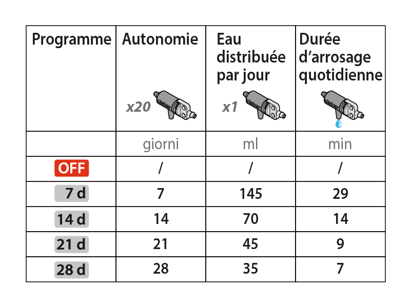 Quel que soit le niveau d'eau dans le réservoir, Oasis Evolution fournira chaque jour la même quantité d'eau à vos plantes (voir le tableau), pendant la période programmé ; cela grâce à un dispositif interne spécial d'autorégulation de la pression d'eau. Comme indiqué dans le tableau, le temps et la distribution d'eau changent en fonction du programme choisi.