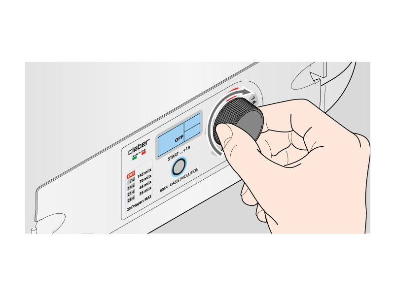Oasis Evolution propose 5 programmes (4+OFF) expressément élaborés pour une autonomie de 7, 14, 21, 28 jours, que vous pouvez sélectionner à l'aide du bouton de sélection situé sur la face avant. Le premier déclic de la manette allumera l'afficheur.