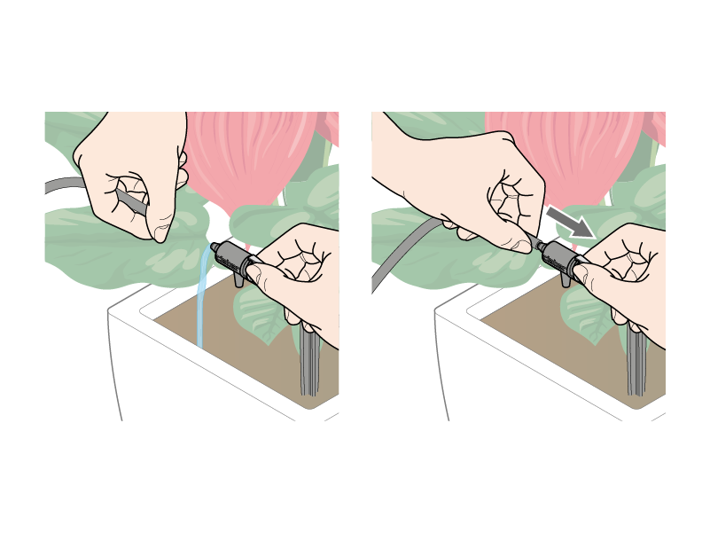 Pour le fonctionnement correct d'Oasis Evolution il est préférable que les deux tronçons du tuyau de distribution raccordés au panneau du réservoir aient une longueur suffisante pour toucher le sol avant d'être reliés aux goutteurs des premiers pots : cette simple opération est nécessaire pour garantir un départ correct de l'arrosage.
