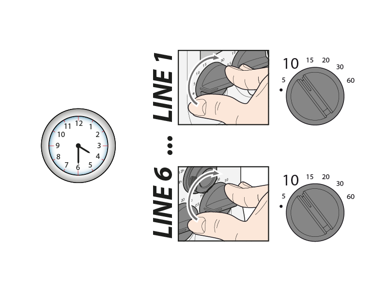 Pour programmer un cycle d'arrosage, tournez le sélecteur LINE correspondant à chaque circuit à activer jusqu'à sélectionner le temps voulu. La durée est programmable de 5 à 60 minutes. Si vous désirez par contre exclure l'arrosage sur un circuit, tournez le sélecteur correspondant en le positionnant sur "• " (ZÉRO).