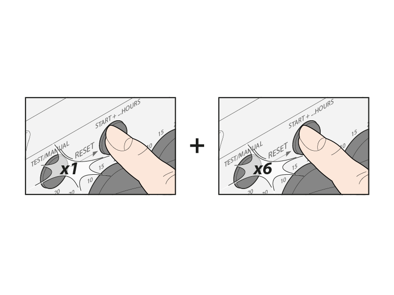 Vous souhaitez que l'arrosage ne démarre pas tout de suite, mais seulement à 22:30 (donc 6 heures après) : appuyez sur la touche START+..., puis appuyez de nouveau 6 fois consécutivement sur cette même touche. L'écran devra alors afficher 6:00.