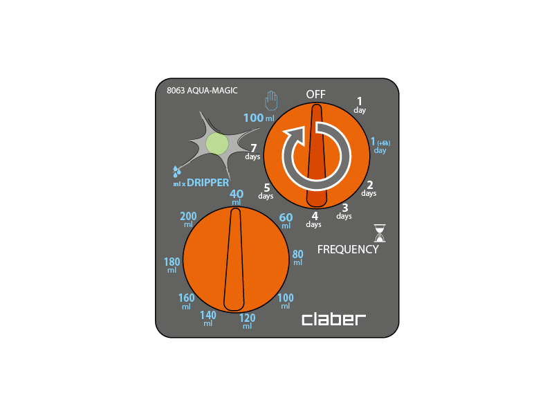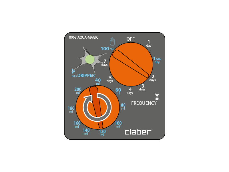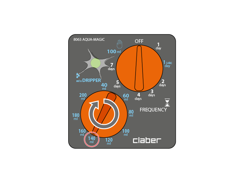 Combien arroser (quantité en ml par jour par goutteur). À l'heure où vous souhaitez que l'arrosage démarre, réglez la QUANTITÉ d'eau à distribuer par jour pour chaque goutteur en tournant le sélecteur « DRIPPER » (goutteur) sur la valeur souhaitée : la LED reste éteinte pour indiquer que la programmation n'est pas complète (le programmateur n'arrosera pas automatiquement tant que la FRÉQUENCE ne sera pas réglée). Les quantités sont prédéfinies et NON modifiables.