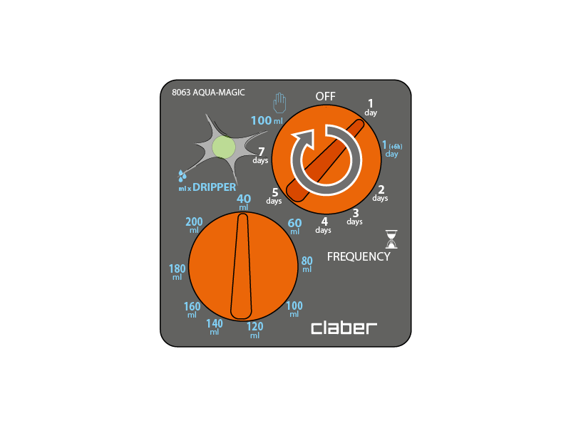 Combien de fois souhaite-on arroser ? (fréquence d'arrosage). Réglez la FRÉQUENCE de l'arrosage en tournant le sélecteur « FREQUENCY » (fréquence) : la programmation est complète, la LED clignote rapidement pendant quelques secondes, puis LENTEMENT (1 clignotement toutes les 2 secondes). Après la programmation, un arrosage démarrera immédiatement. L’arrosage s'arrêtera lorsque la quantité d'eau programmée avec le sélecteur « DRIPPER » (goutteur) sera distribuée. Les fréquences sont prédéfinies et NON modifiables.