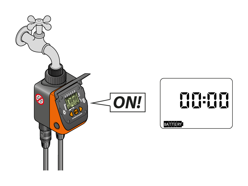 Dès que la pile est raccordée, l'afficheur s'allume, la vanne fait un cycle d'essai et le programmateur se règle sur l'horaire 00:00.