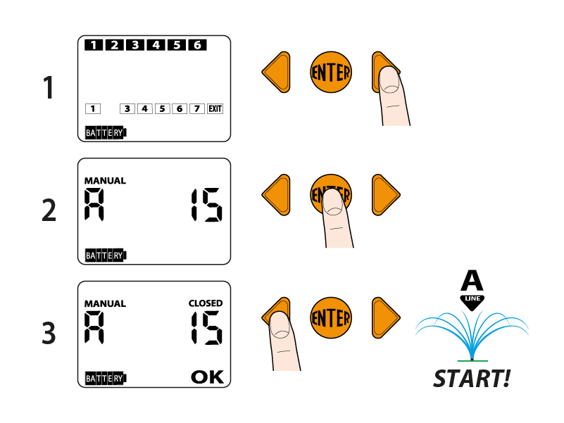 Avec la flèche droite, entrez dans la page de la programmation manuelle : fonction utile pour effectuer un ultérieur arrosage sans supprimer les programmes définis. Le programmateur règle automatiquement un temps d'arrosage de 15 minutes. Appuyez sur ENTER. Avec la flèche gauche, on active l'arrosage. À chaque pression de la touche gauche, le temps d'arrosage augmente de 5 minutes jusqu'à un maximum de 60 minutes.