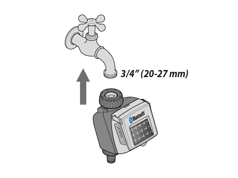 Branchez le programmateur sur un robinet d’eau domestique. Assurez-vous que le robinet soit muni d’un raccord fileté mâle de 3/4”(utilisez un adaptateur, si nécessaire).