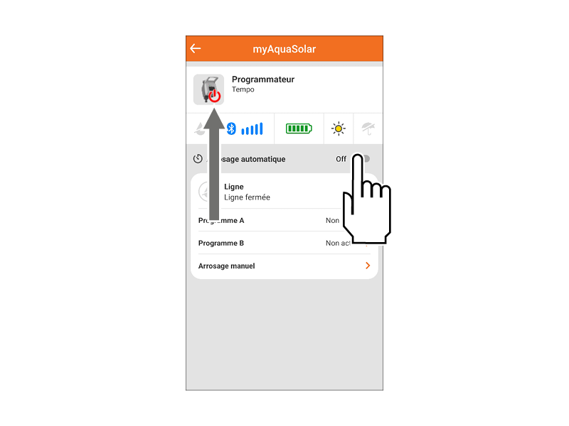 Pour activer/désactiver l’arrosage automatique d’un programmateur, appuyez sur sa carte produit.