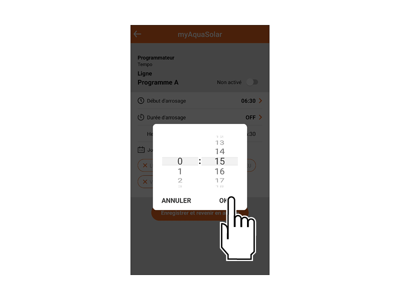 Faites défiler les chiffres des heures et des minutes jusqu’à ce que l’heure à laquelle vous souhaitez commencer l’arrosage soit atteinte et confirmez.