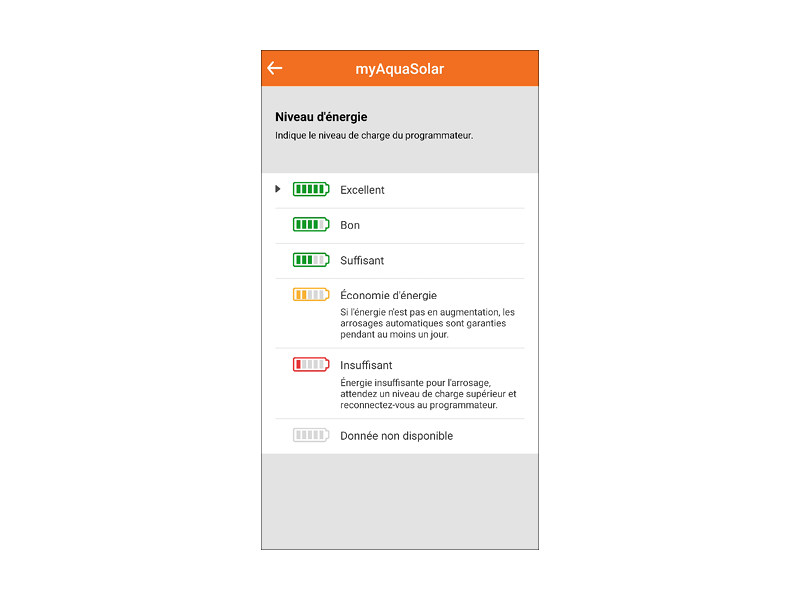 Si l’icône du niveau d’énergie est grise, placez le programmateur avec le panneau photovoltaïque exposé à la lumière directe du soleil.