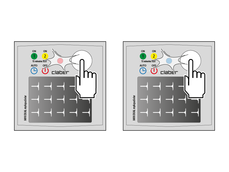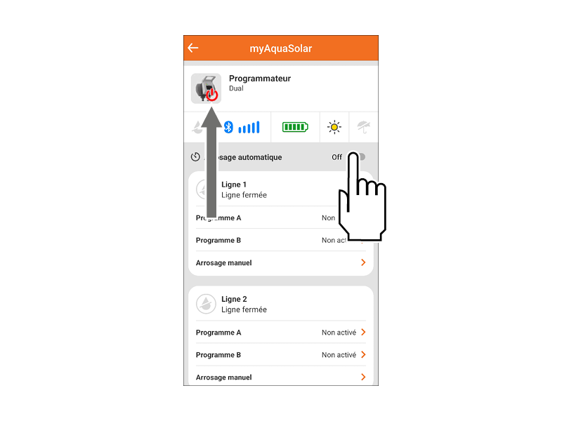 Pour activer l’arrosage manuel depuis programmateur, appuyez plusieurs fois sur le bouton de Dual myAquaSolar jusqu’à ce que la LED clignote en vert ou en jaune en fonction de la ligne souhaitée. Dans ce cas, un arrosage manuel de 15 minutes s’activera sur la ligne choisie.