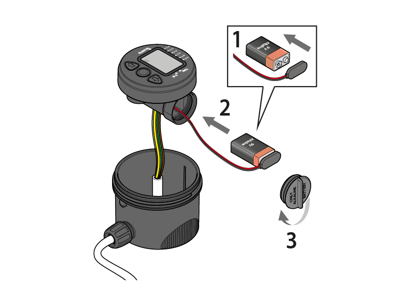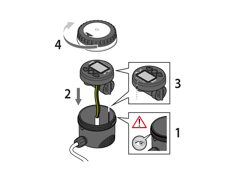 Revissez le bouchon en contrôlant que le joint d'étanchéité soit correctement dans son logement. Repositionnez le module de commande en suivant le guide et refermez le couvercle transparent en contrôlant que le joint d'étanchéité soit correctement positionné dans son logement. Avec l'arrivée de la nouvelle saison, insérez une nouvelle pile.