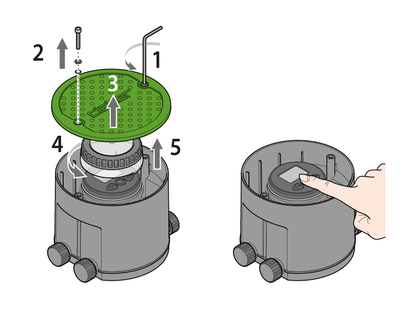 Évissez les deux vis sur le couvercle du regard, retirez-les et enlevez le couvercle. Dévissez le couvercle en plastique qui protège le programmateur et soulevez-le.