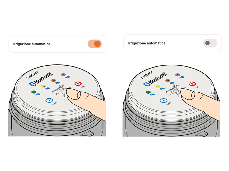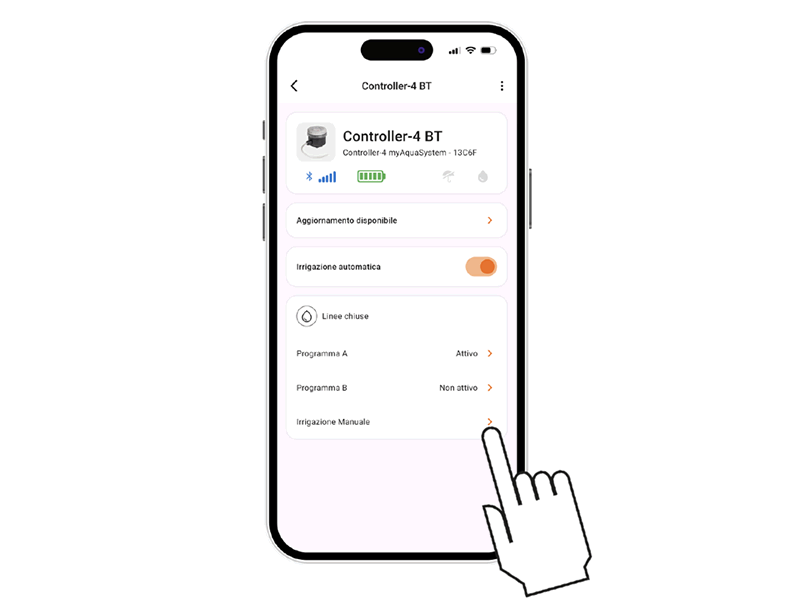 Pour activer l’arrosage manuel depuis le programmateur, appuyez plusieurs fois sur le bouton du Controller4 BT jusqu’à ce que la LED clignote de la couleur de la ligne à ouvrir : ligne 1 VERT, ligne 2 JAUNE, ligne 3 ORANGE, ligne 4 VIOLET.