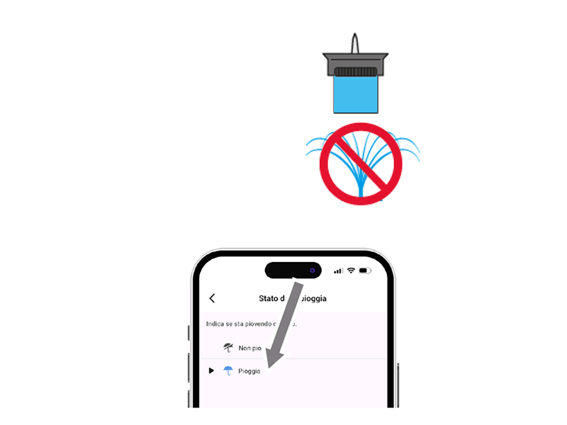 Le capteur de pluie communique son état au programmateur : si le réservoir est plein (pluviométrie d’au moins 5 mm), l’arrosage ne démarrera pas et tout arrosage en cours sera interrompu sous 1 minute. L’ouverture manuelle de la vanne, via le bouton ou l’application, reste possible même lorsque le capteur de pluie est actif.