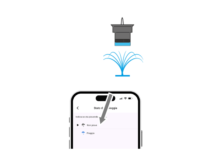 Le capteur de pluie communique son état au programmateur : si le réservoir est plein (pluviométrie d’au moins 5 mm), l’arrosage ne démarrera pas et tout arrosage en cours sera interrompu sous 1 minute. L’ouverture manuelle de la vanne, via le bouton ou l’application, reste possible même lorsque le capteur de pluie est actif.