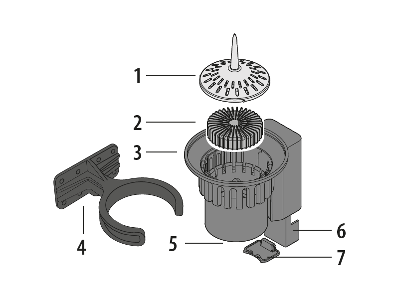 Pour un fonctionnement correct, placer le flotteur dans le récipient avec les ailettes radiales vers le haut et le fond orange vers le bas.