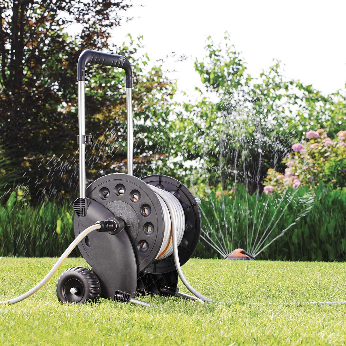 Dévidoir Ecosei démonté en kit, équipé avec : couronne de 20 m de tuyau Silver Elegant Plus Ø 12,5 mm, nez de robinet 20-27 mm avec réduction 15-21 mm, 4 raccords pour le tuyau et pour la rallonge, lance d’arrosage et support tuyau.