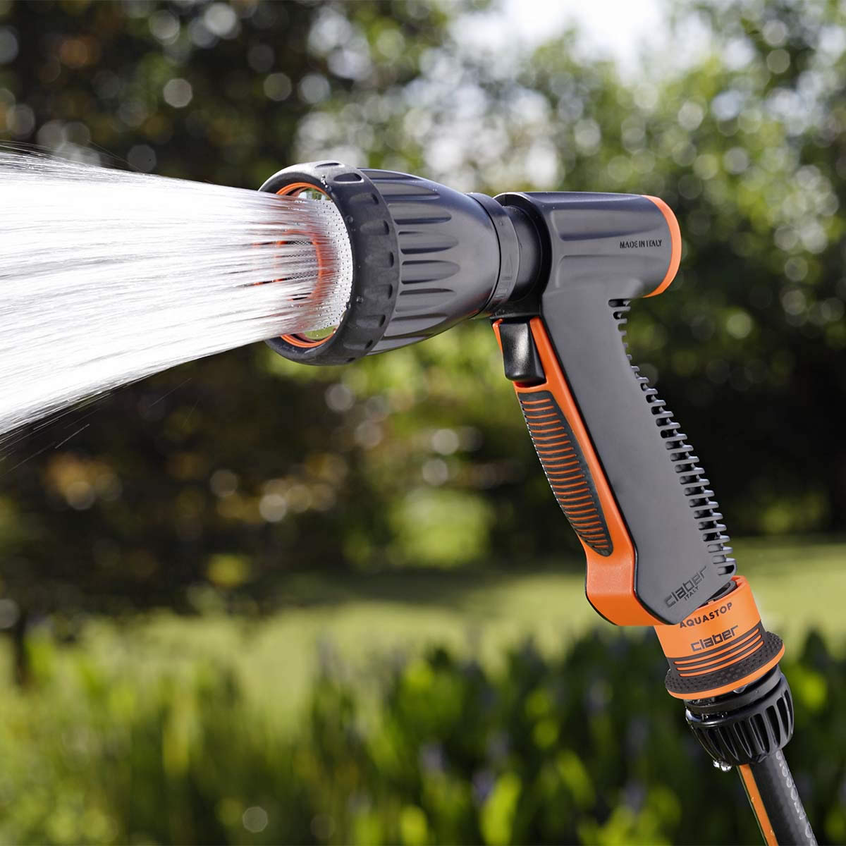 Douche pistolet avec aérateur, poignée anatomique caoutchoutée et mécanisme commode antérieur à bouton pratique pour l’ouverture et la fermeture du débit. Manette arriére de réglage du débit d’eau. Bague caoutchouc antichoc, ouvrante pour inspection et nettoyage. L’aérateur, amovible et nettoyable, permet d’obtenir un jet léger d’eau mélangée avec des bulles d’air pour arroser les plantes sans éclaboussure.