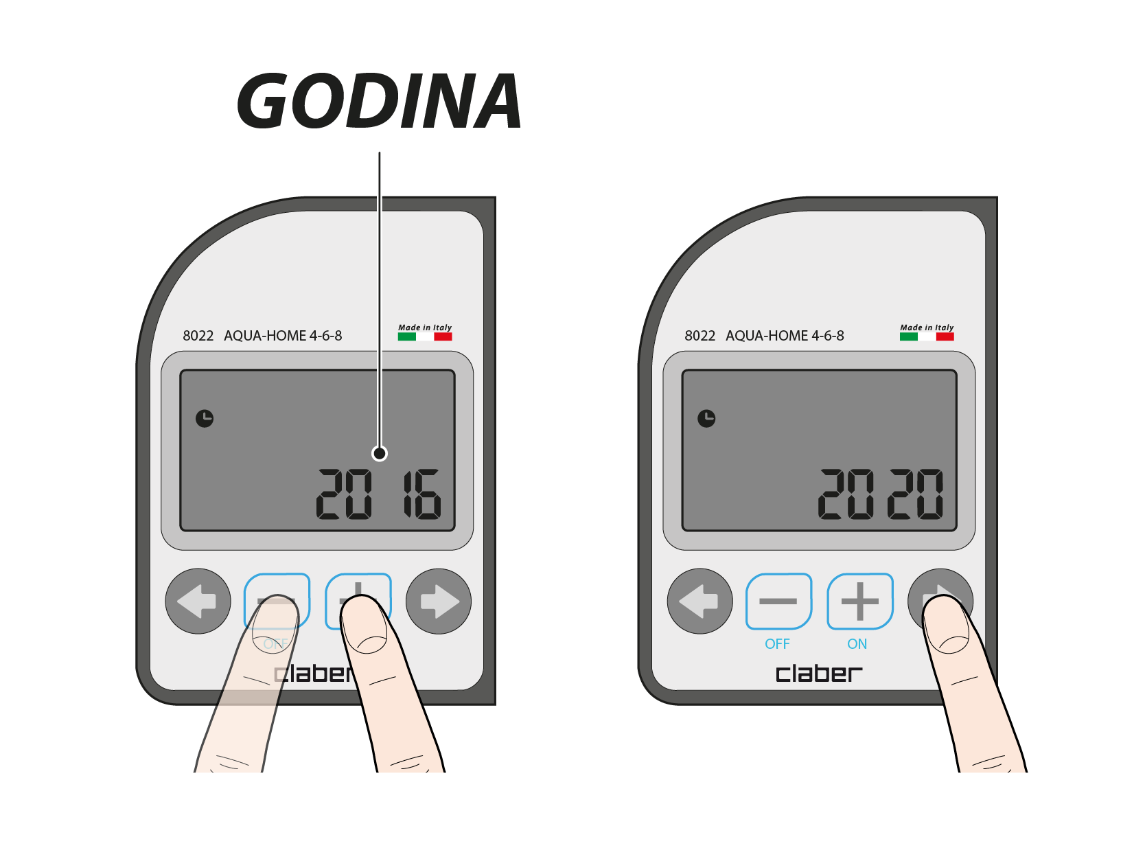 Na prve tri programske stranice postavlja se trenutni datum: sat, mjesec i dan i godina. Pomocu tipki - i + možete promijeniti prikazane vrijednosti. Za pomicanje stranica koristite strelice.