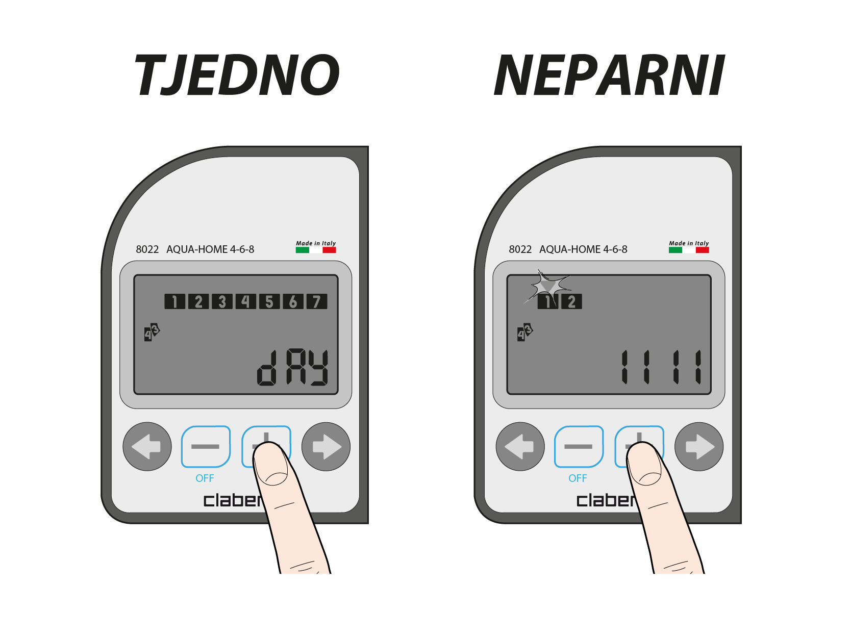 programiranje parnim danima; ciklicno programiranje. Pomocu tipki - i + možete promijeniti vrijednosti. Za pomicanje stranica koristite strelice. Desnom strelicom vracate se na stranicu na kojoj je prikazano vrijeme i dan u tjednu.