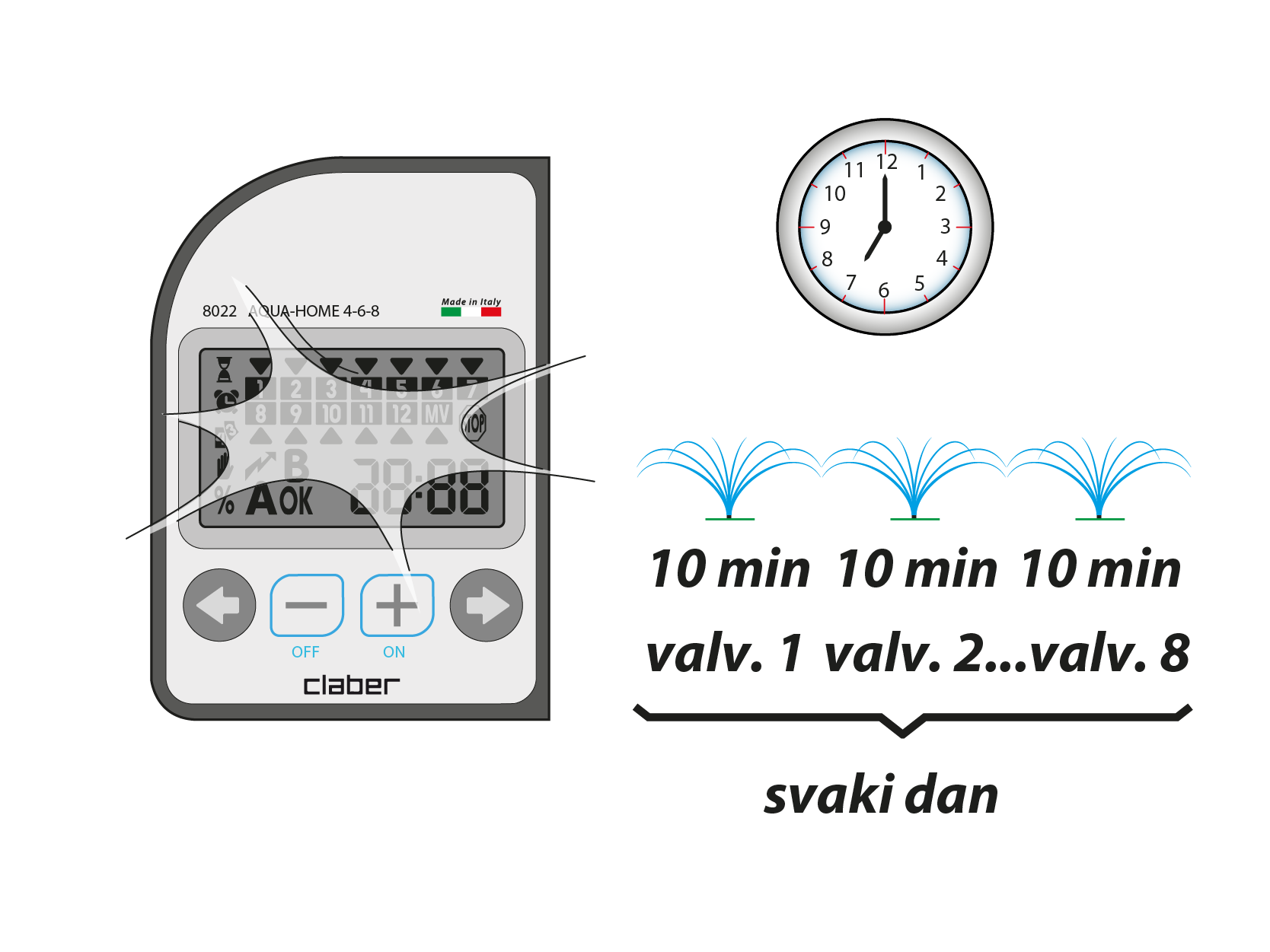 Trajanje koje se može podesiti pomocu tipki - i + krece se od 1 minute do 4 sata i 15 minuta. Prema zadanim postavkama, svaki ventil je unaprijed postavljen s vremenom otvaranja od 10 minuta. Ako ne želite koristiti ventil, pritisnite tipku - dok se ne pojavi OFF.