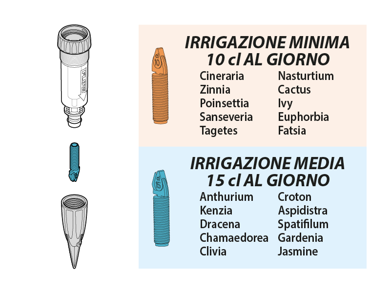 Scegliere il gocciolatore più adatto al tipo di pianta. Autonomia con bottiglia da 2 l: max 20 giorni.
