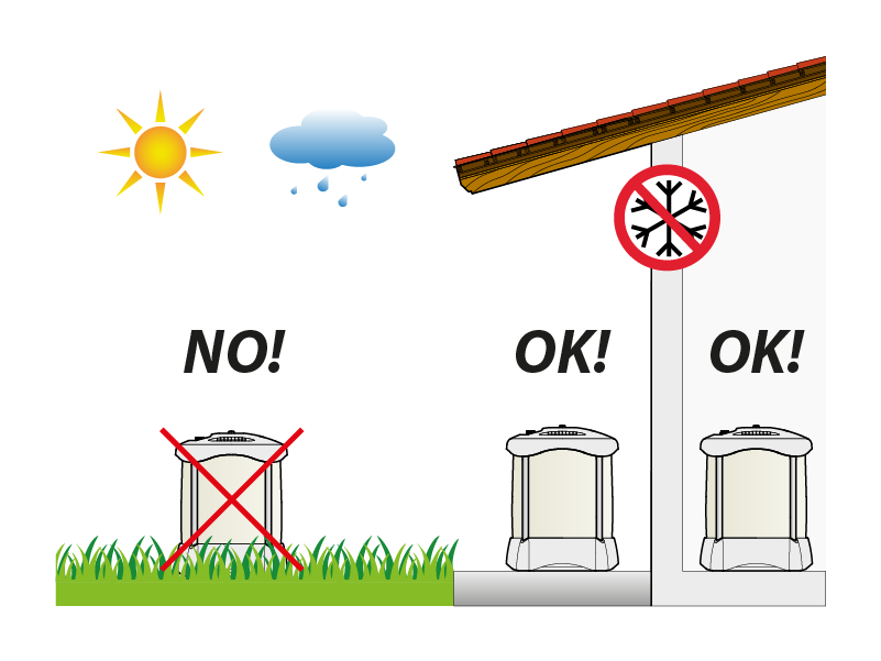 Aqualux deve essere installato in ambienti protetti da agenti atmosferici e intemperie; per evitare il riscaldamento dell‘acqua nel serbatoio interno, si raccomanda di collocare Aqualux all’ombra e al fresco, lontano da finestre e vetrate, o comunque lontano dall‘esposizione diretta ai raggi del sole.