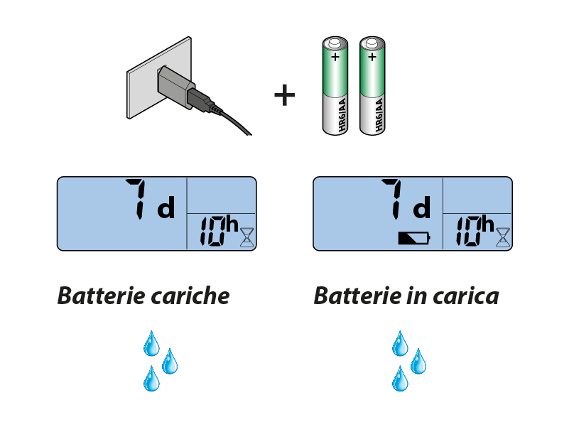 - con batterie ricaricabili da 1,2V NiMH minimo 2400 mAh tipo AA/HR6, ma nel caso in cui queste si scarichino completamente non verranno eseguite irrigazioni;