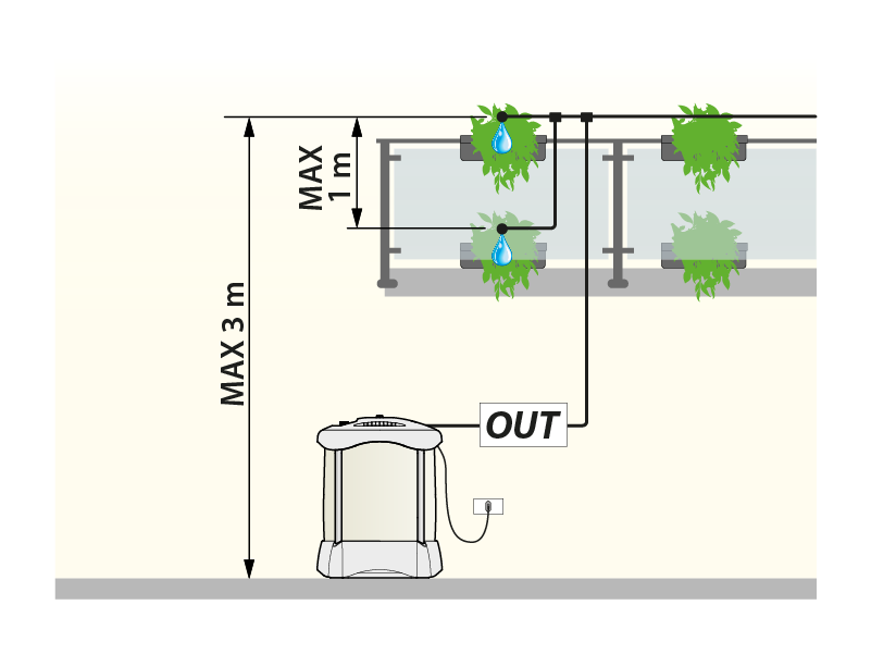 Indipendentemente dal livello dell‘acqua presente nel serbatoio, salvo che questa non sia esaurita, Aqualux fornirà ogni giorno la stessa quantità d‘acqua ai vostri vasi in base al programma scelto.