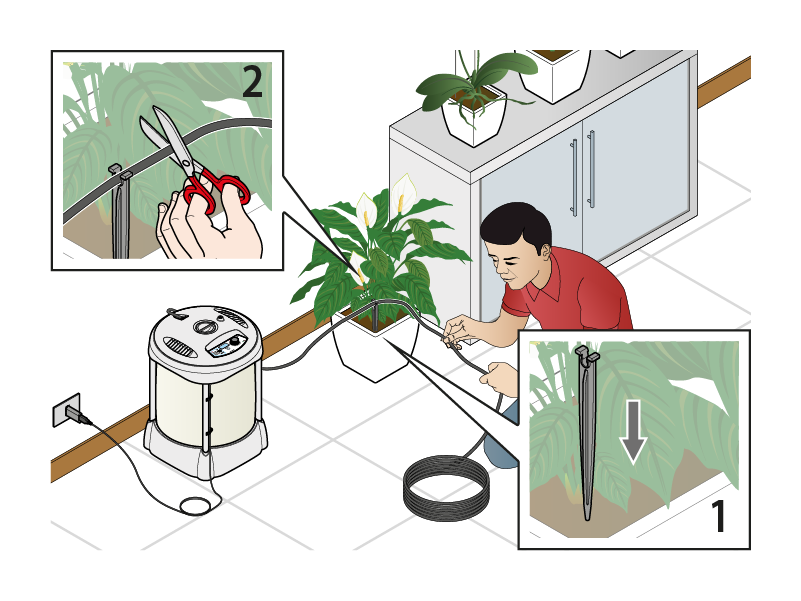 Piantare uno o più picchetti per vaso a seconda del numero di gocciolatori da utilizzare e tagliare il tubo a 2 cm dal picchetto.