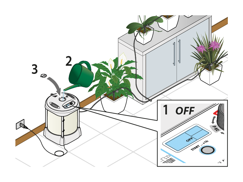 Posizionare il selettore su OFF e riempire il serbatoio con acqua pulita (al massimo 30 litri), priva di sostanze chimiche o fertilizzanti. Ricordarsi di chiudere il coperchio con il tappo.