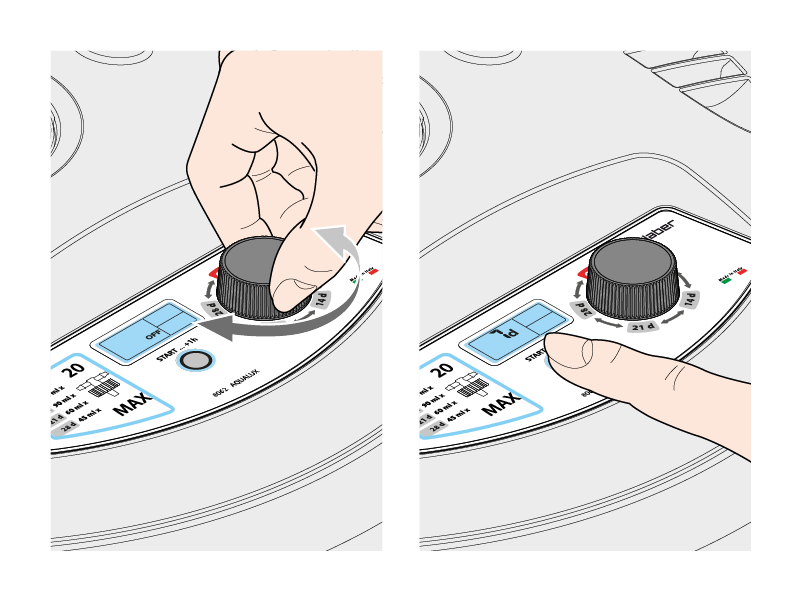 Per selezionare il programma desiderato ruotare la manopola selettore dalla posizione OFF alla posizione desiderata: 7, 14, 21 o 28 days (giorni) e premere START.