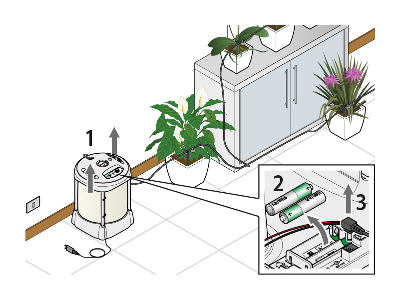 - collegato alla corrente elettrica e con batterie ricaricabili da 1,2V NiMH minimo 2400 mAh tipo AA/HR6, garantendo in questo modo l’irrigazione in assenza di una delle fonti di alimentazione.