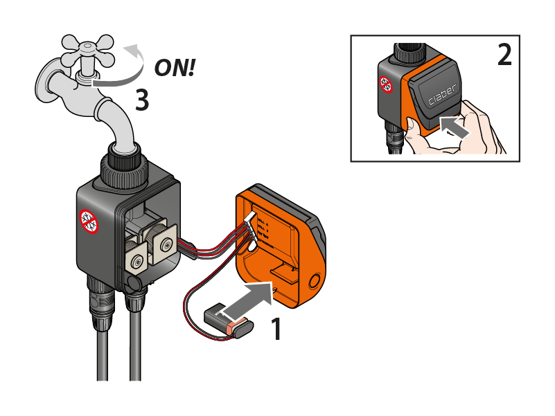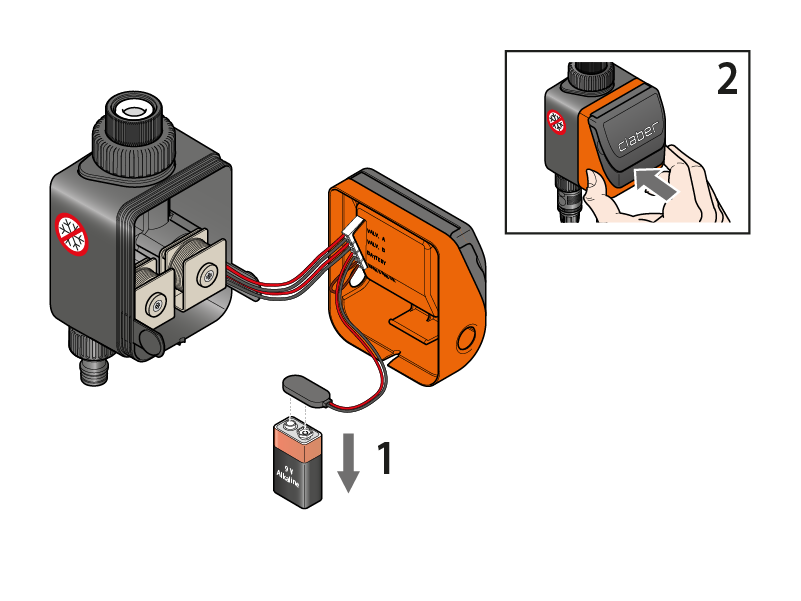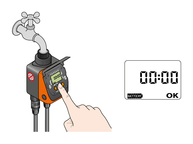 Appena collegata la batteria, il display si accende, la valvola fa un ciclo di prova e il programmatore si imposta sull’orario 00:00.