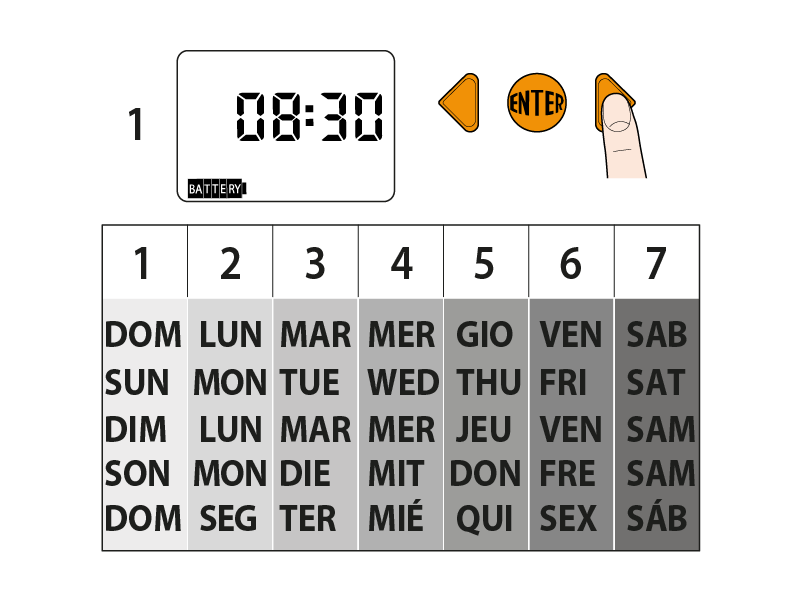 Premendo la freccia destra si entra nella pagina della programmazione settimanale. Premere ENTER per scegliere i giorni in cui si vuole irrigare.
