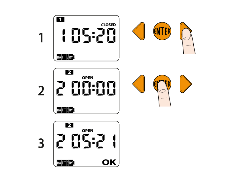 Il display visualizza il simbolo OK ad indicare che si può impostare l’orario di apertura. Il programmatore automaticamente propone l’orario di apertura ad 1 minuto successivo rispetto all’orario di chiusura precedentemente impostato (del programma 1 - h 05:21). Con le frecce scegliere l’orario di apertura desiderato (es 05:50). Sul display, in alto, si visualizza 2 (programma 2). Confermare l’orario premendo ENTER.