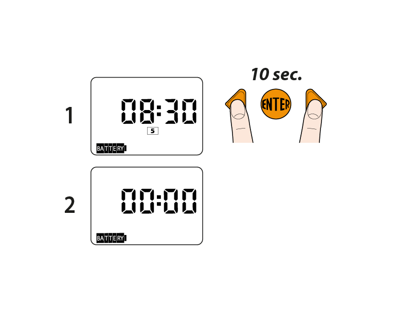 Per resettare completamente il programmatore tenere premute contemporaneamente le due frecce per almeno 10 secondi, finché sul display compare 00:00.