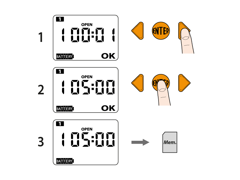 Attenzione: tutti i programmi si impostano allo stesso modo. I programmi vanno inseriti in successione temporale, entro le 24 h solari. In automatico il programmatore avanza, sia in OPEN che in CLOSED, di 1 minuto rispetto all’ultimo orario impostato.