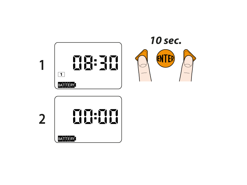 Per resettare completamente il programmatore tenere premute contemporaneamente le due frecce per almeno 10 secondi, finché sul display compare 00:00.